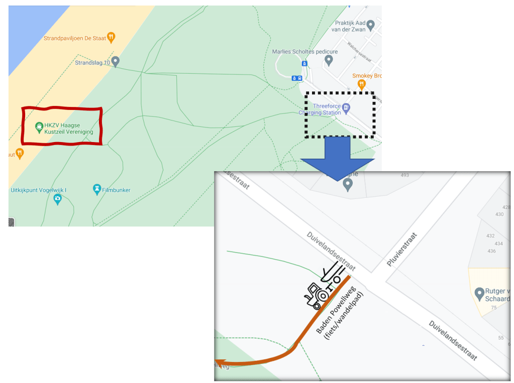 Strandopgang Duivelandstraat/Pluvierstraat. Navigatie: Baden Powellweg, Den Haag. Routebeschrijving: via Den Haag Zuid / Kijkduin in verband met wegafsluitingen in Den Haag Centrum wegens de NAVO-top.
